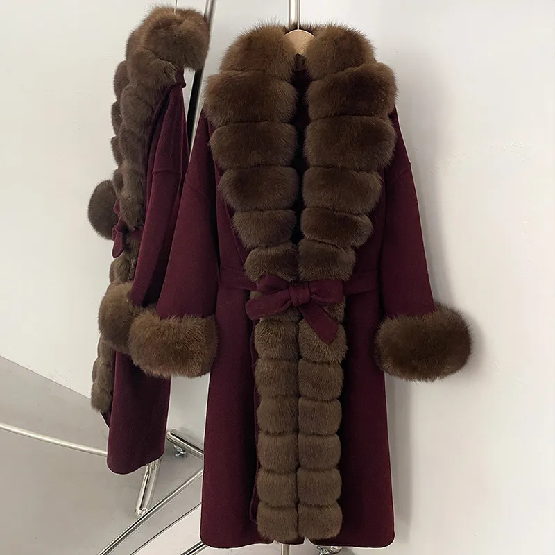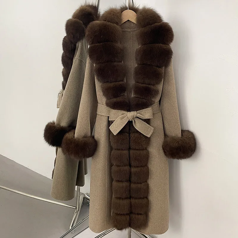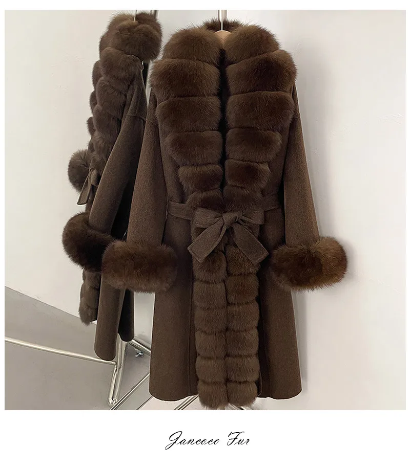 Jancoco Women Winter Real Wool Coat Belted Woolen Trench Coat Ladies Hooded Wool Coat with Fox Fur Collar Cuff