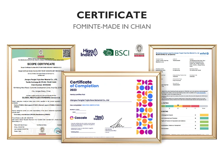 -We have multiple product certifications such as BSCI, Higg FEM, BV-GRS, and SGS.