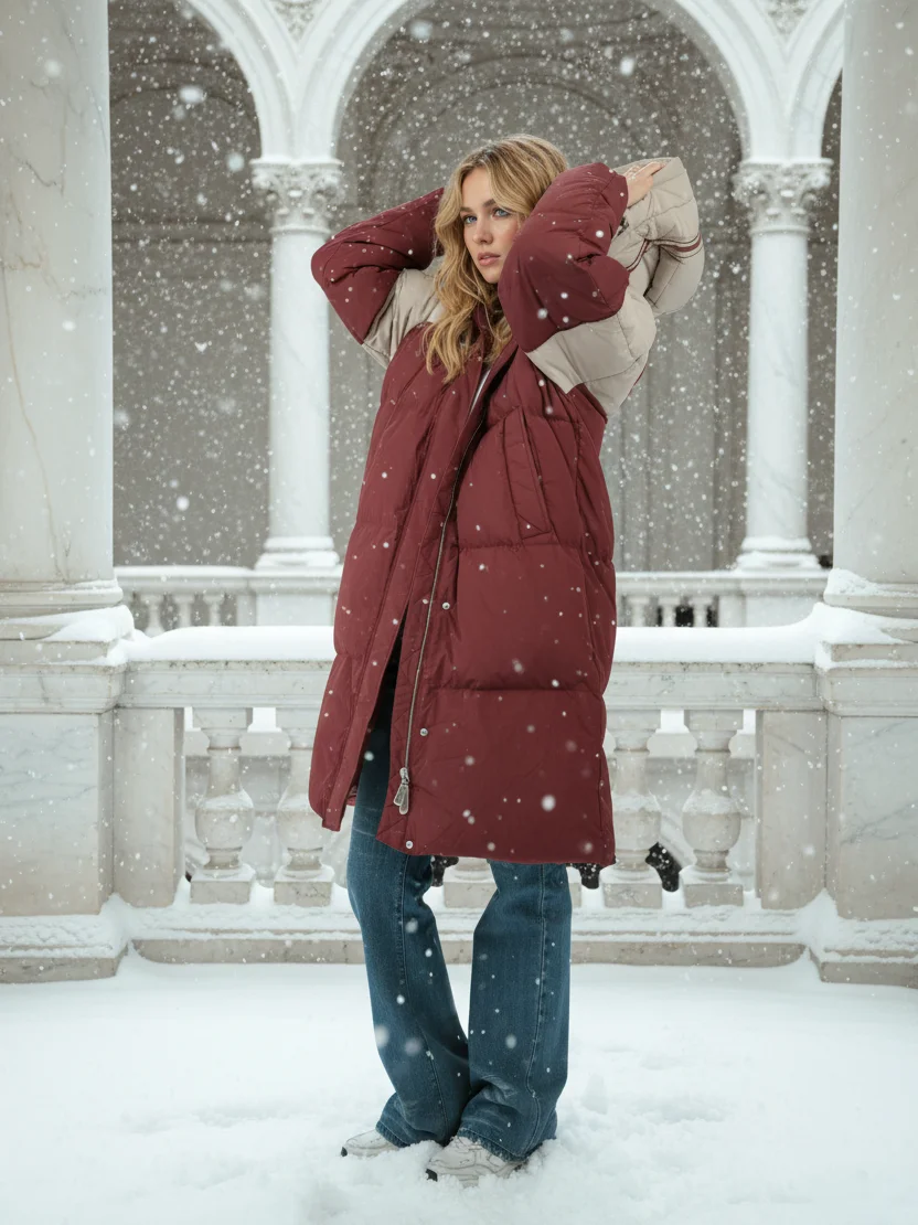 Thoughtful Design, Blending Comfort & Playfulness With its knee – length cut, it provides comprehensive protection for the knees against the cold. The large, rounded side pockets are not just practical for storing essentials but also add a touch of cuteness and playfulness, breaking the traditional dull image of down jackets. The high – fill design truly gives you the cozy feeling of "wearing a quilt", wrapping you in warmth and comfort.